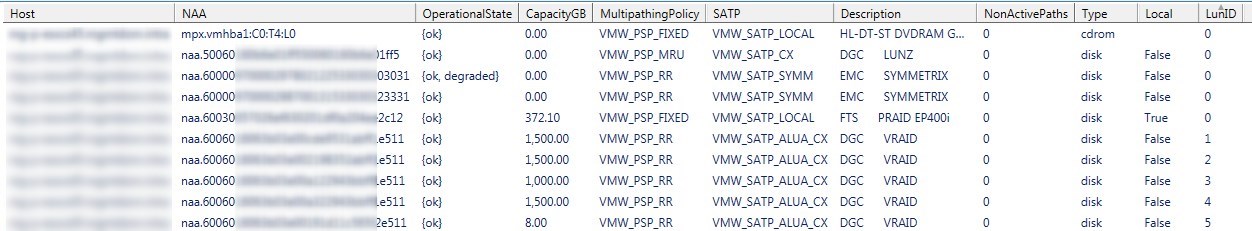 I recently needed to check the path selection policy on a large number of Luns on a large number of hosts. The idea of doing it in the web client was worse than the 35 degrees outside so I decided to script it.